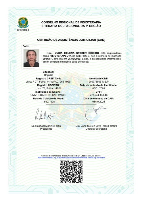 A Certidão de Assistência Domiciliar, como a da profissional LUCIA HELENA STORER RIBEIRO (inscrição 29042-F no CREFITO-3), é um selo de segurança para você e sua família, assegurando que o atendimento será realizado por um profissional com a qualificação e o respaldo do seu órgão regulador.