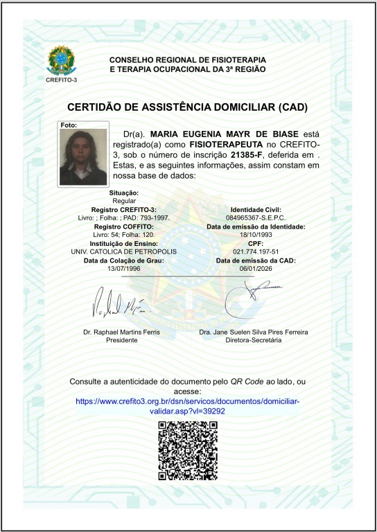 A Certidão de Assistência Domiciliar, como a da profissional MARIA EUGÊNIA MAIR DE BIASE (inscrição 21385-F no CREFITO-3), é um selo de segurança para você e sua família, assegurando que o atendimento será realizado por um profissional com a qualificação e o respaldo do seu órgão regulador.
